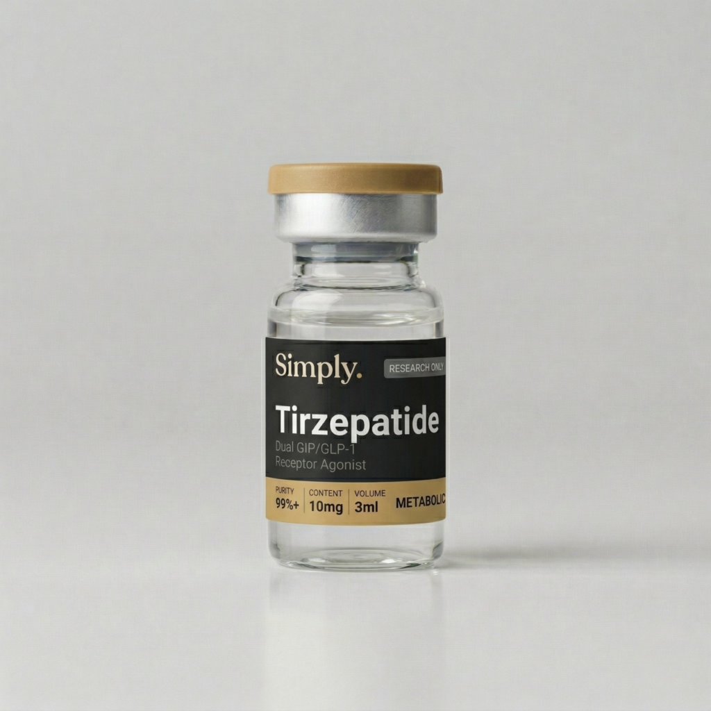 Tirzepatide is a dual action research peptide that targets both GLP-1 and GIP receptors simultaneously. This dual mechanism has made it one of the most extensively studied compounds in metabolic research, with multiple large scale clinical trials demonstrating its effects on body composition and glucose metabolism. Each vial contains 10mg of lyophilized Tirzepatide at 99%+ purity, verified by third party testing. Certificate of Analysis available for download above. Store lyophilized at -20°C for up to 24 months. Once reconstituted with bacteriostatic water, store at 2 to 8°C and use within 30 days.